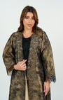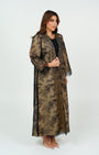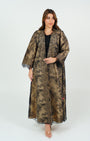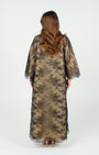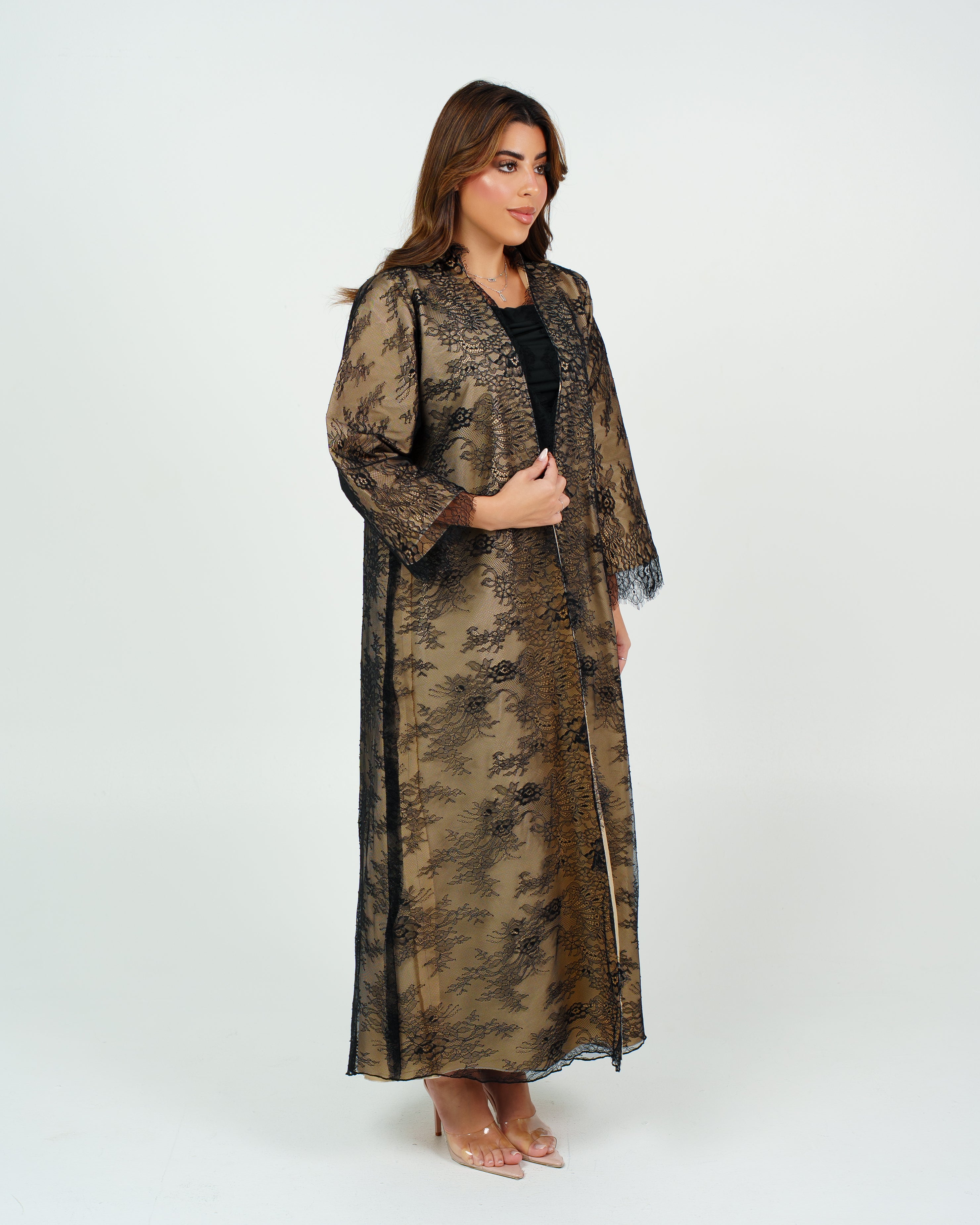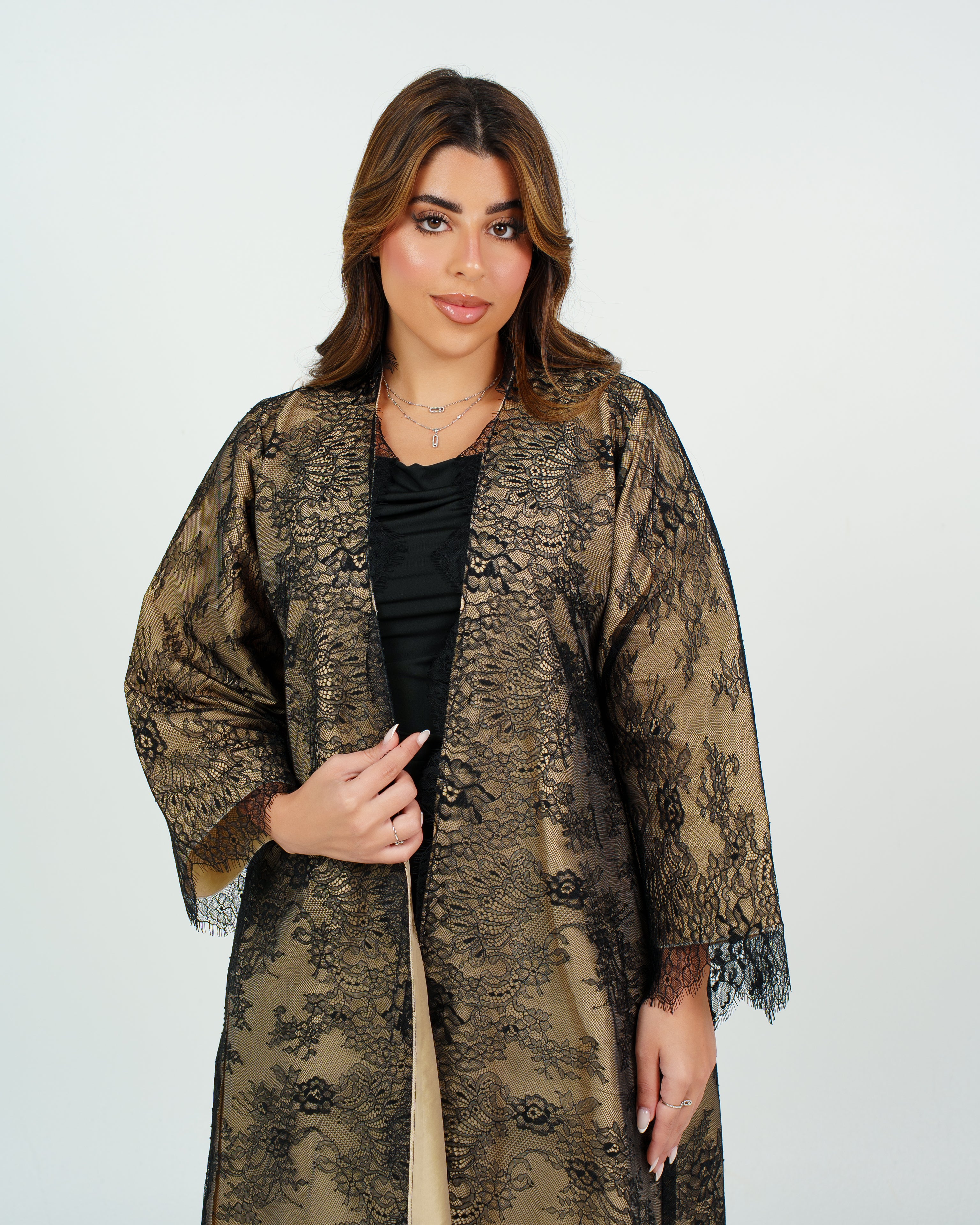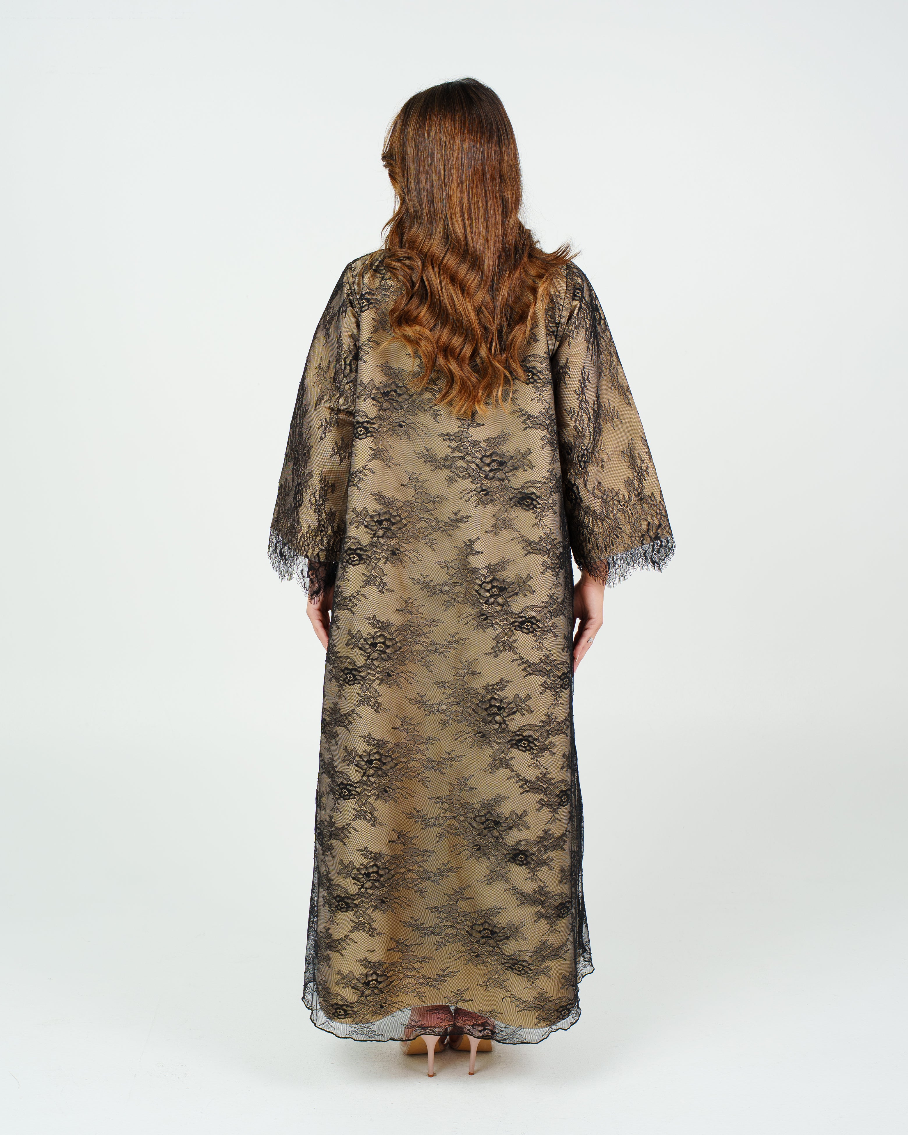 A black lace abaya with a beige lining that adds a touch of feminine elegance and a luxurious look perfect for any occasion. '' Black Sheila Included ''
